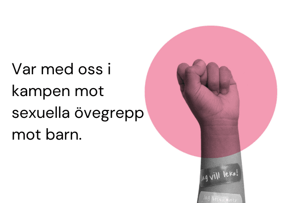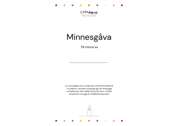 BIDRA TILL VÅRT ARBETE SwishaDet snabbaste sättet att stötta vårt arbete på. Swisha valfritt belopp till 90 900 36. Bli företagspartnerPartnerskap är grunden för allt vårt arbete och det finns många sätt som du och ditt företag kan stötta Childhood på. Ge en direktgåvaEtt snabbt och enkelt sätt att bidra till vårt arbete. Ge en bankgirogåvaSätt in en gåva på 909 – 0036. Bli månadsgivareEtt sätt att kontinuerligt bidra till vårt arbete med att förebygga sexuella övergrepp mot barn. TestamenteDin framtida gåva gör det möjligt för oss att fortsätta vårt arbete med att förebygga sexuella övergrepp mot barn. MinnesgåvaAtt ge en minnesgåva när någon går bort är ett fint sätt att hylla en person och bidra till vårt arbete. GåvokortDen finaste presenten är ett gåvokort från Childhood. Starta en insamlingStarta en insamling till förmån för Childhood i samband med exempelvis din födelsedag. Kontakta info@childhood.org för mer information. BarnrättsplåstretDet kan vara svårt att prata med barn om deras rättigheter. Våra barnrättsplåster gör det enklare. Childhood-armbandVårt arbete utgår från FN:s Barnkonvention. De olikfärgade pärlorna representerar olika artiklar ur Barnkonventionen. Pärla armbandPärla Childhood-armband tillsammans med familj, vänner, kollegor och andra som står upp för alla barns rätt till en trygg uppväxt.